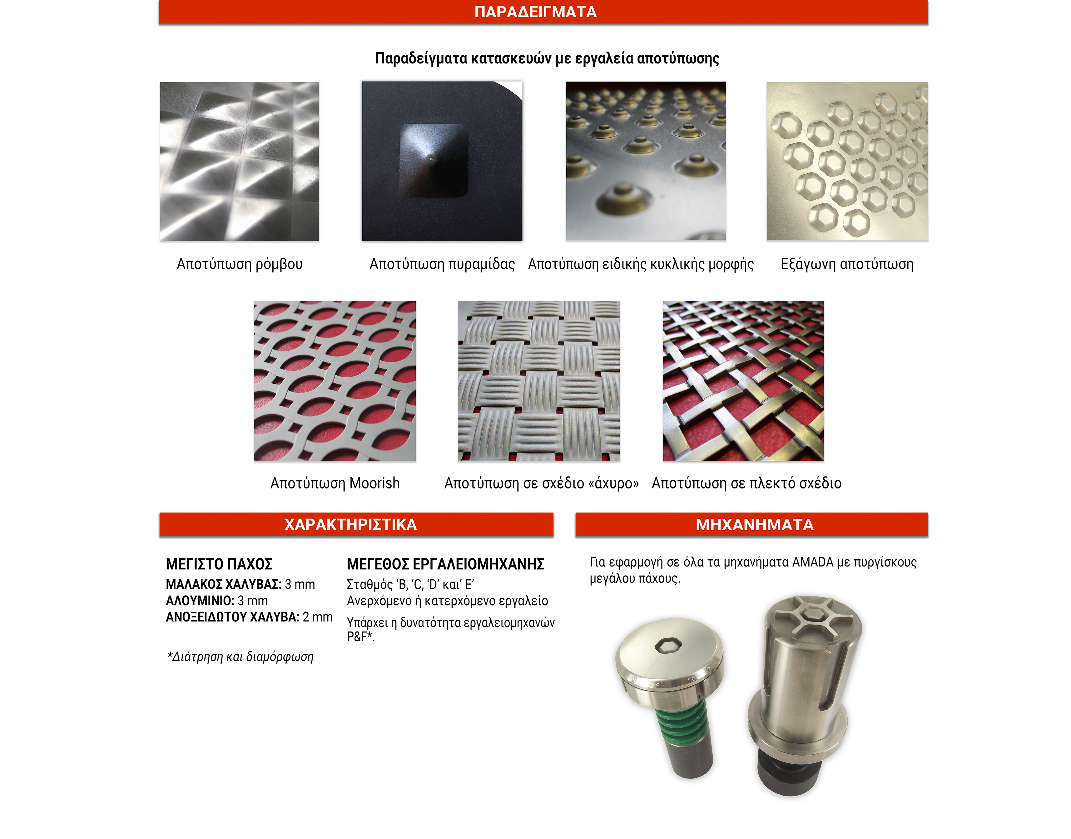 Λύσεις μεμονωμένης ή σε συστάδα διαμόρφωσης για διακοσμητικά εφέ. Αυτές οι λύσεις προσφέρουν πολλές δυνατότητες δημιουργίας μοναδικών και ελκυστικών σχεδίων σε επιφάνειες από λαμαρίνα. Πιθανές εφαρμογές είναι μεταξύ άλλων διαχωριστικά τοιχία, προσόψεις κτιρίων, μεταλλικά έπιπλα και πόρτες.