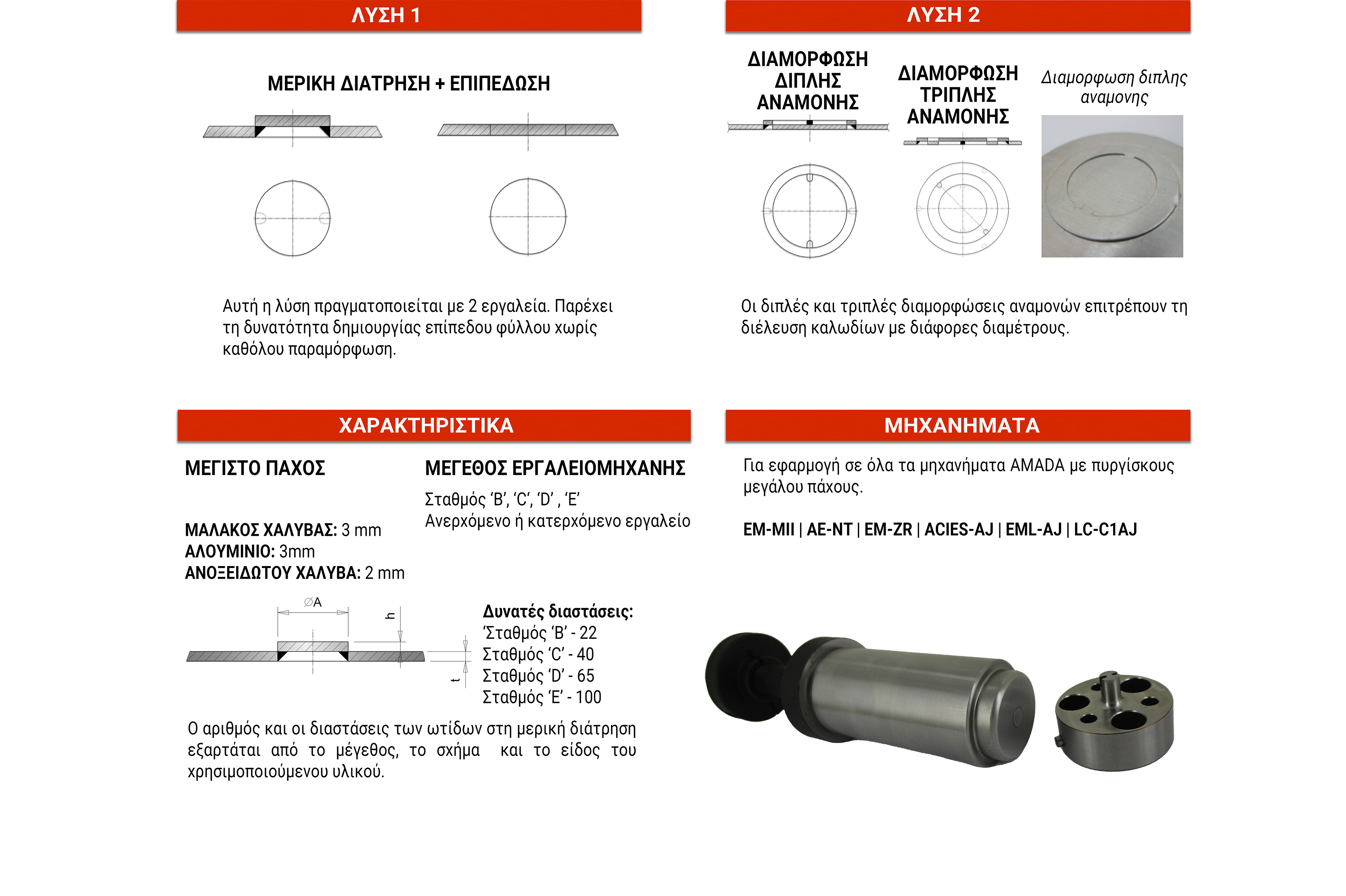 Αυτός ο τύπος διαμόρφωσης επιτρέπει την ακριβή χωροθέτηση των οπών και αποτελεί ιδανική λύση για ηλεκτρολογικά ερμάρια, ικριώματα εξοπλισμού υπολογιστών και άλλες διατάξεις που απαιτούν το χειροκίνητο άνοιγμα προκαθορισμένων οπών. Ένας γρήγορος, ευχερής και οικονομικός τρόπος δημιουργίας κυκλικών ή με άλλο σχήμα μερικών διατρήσεων επάνω σε επίπεδα φύλλα χωρίς καμία παραμόρφωση. Απολαύστε αποτελέσματα υψηλής ποιότητας με ελάχιστη προσπάθεια και σε ελάχιστο χρόνο.