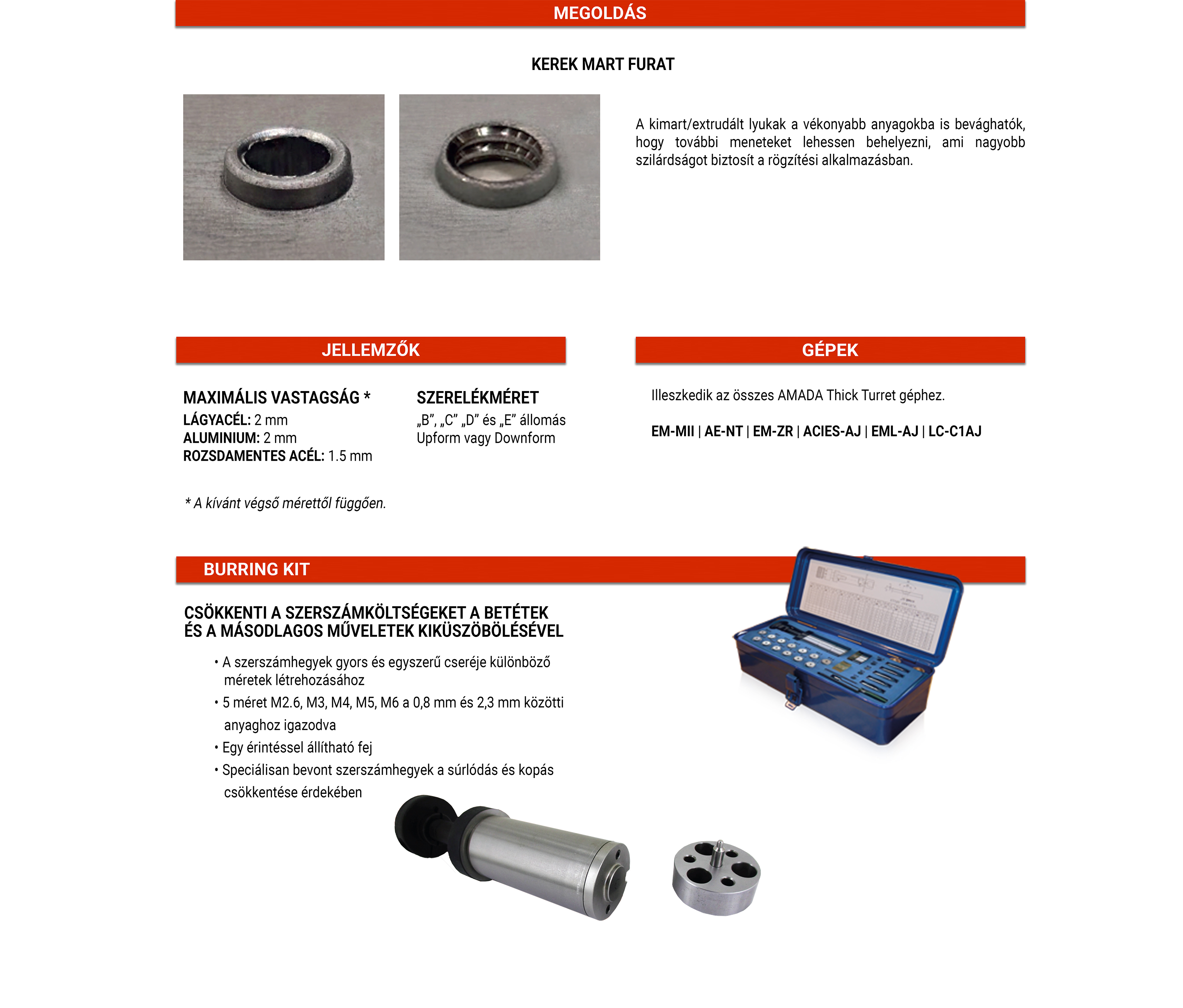A marószerszámok ideálisak vékony anyagok magasságának növelésére, csövek átengedésére, vagy akár szellőztetéshez vagy vízelvezetéshez. Vékony anyagokban a maratott lyukak könnyen kilyukaszthatók, hogy több menetet engedjenek be, nagyobb szilárdságot biztosítva, kiküszöbölve a betétek és másodlagos műveletek szükségességét.