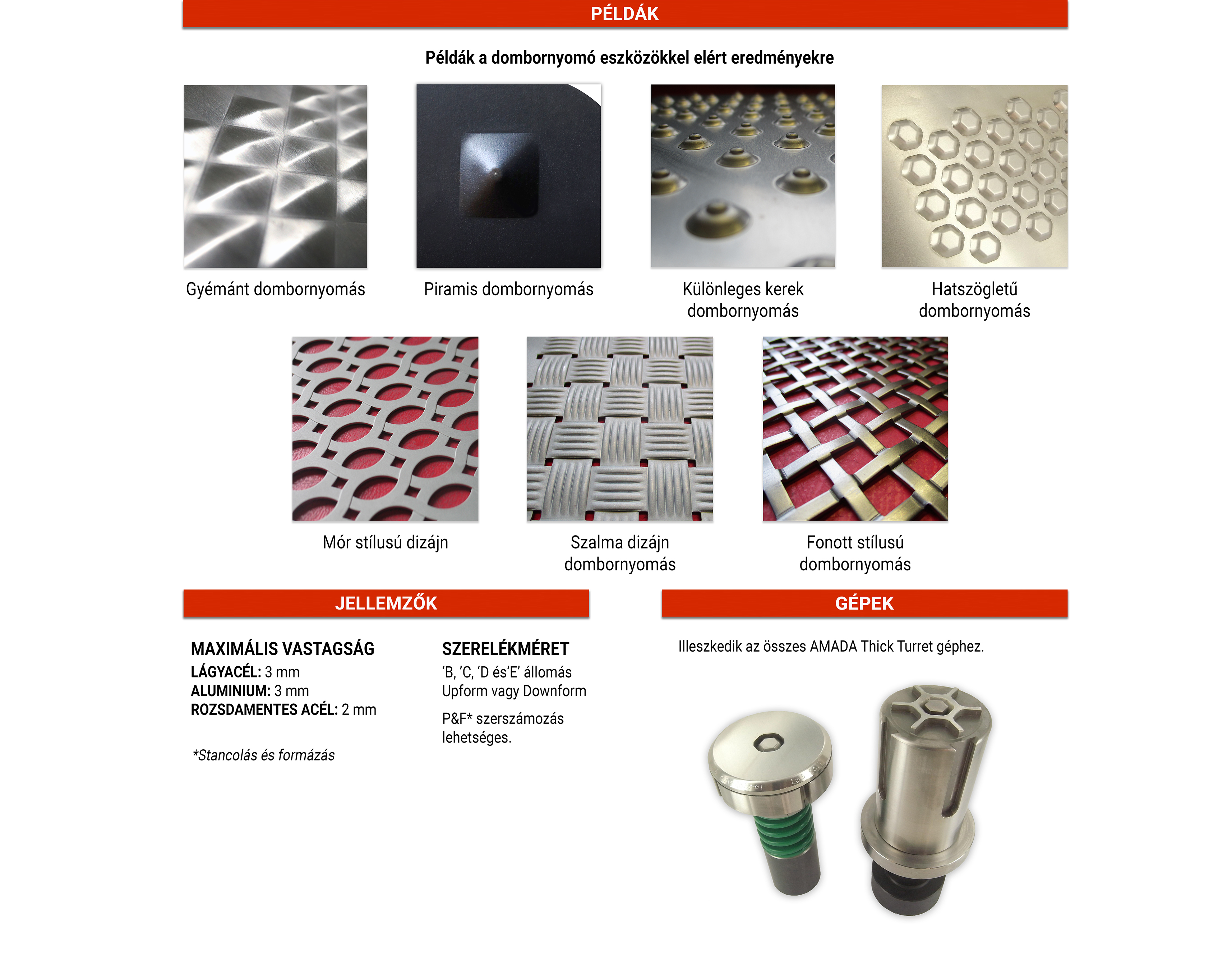 Egyszeri vagy többszörös megoldás dekoratív és díszítő hatásokhoz. Ezek a megoldások lehetőségek széles skáláját kínálják a fémlemezfelületek egyedi és vizuálisan látványos kialakításához. Lehetséges példák alkalmazásokra: válaszfalak, épületek homlokzatai, fém bútorok és ajtók...