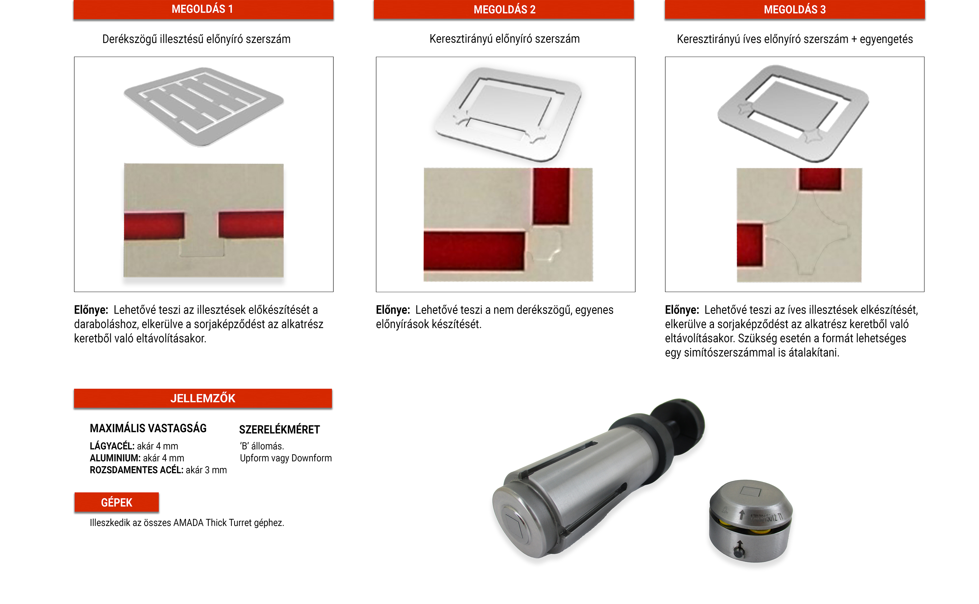 Ez egy hatékony és költséghatékony megoldás a stancolt alkatrészek biztonságos rögzítésére a hordozó lemezhez. Az alkatrészek eltávolítása a keterből egyszerű, gyors és biztonságos. A különböző formák és méretek választékának köszönhetően különböző illesztési megoldások lehetségesek.