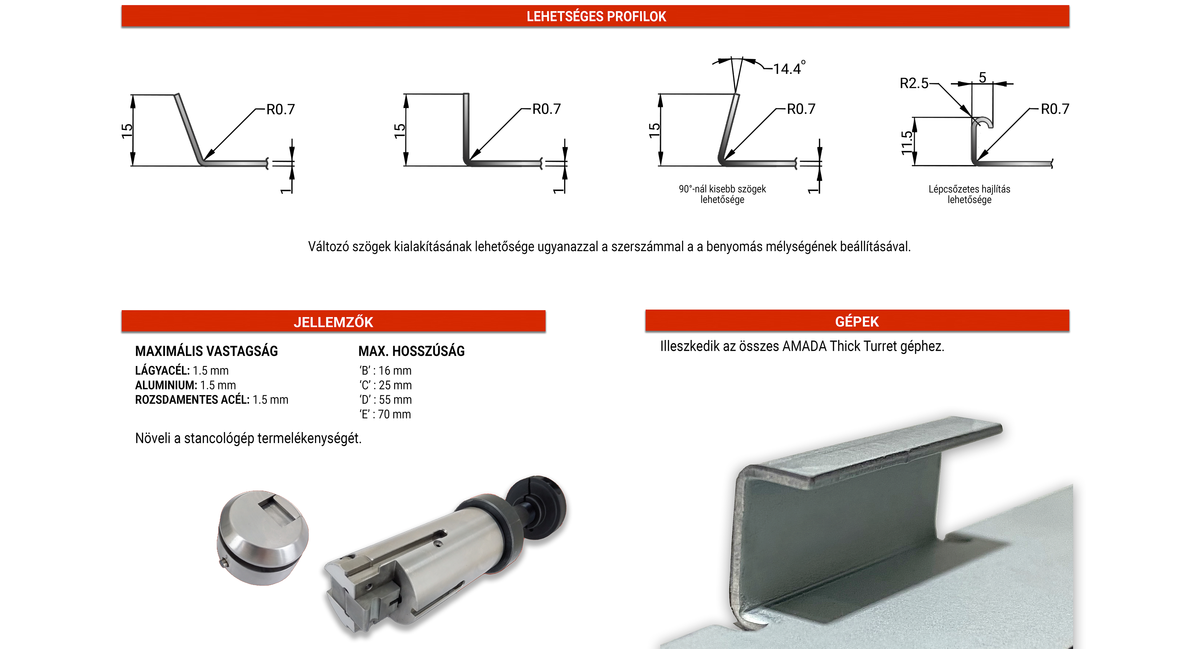 Ideális megoldás a stancológépen végzett hajlítási műveletek optimalizálása, elkerülve a felesleges másodlagos műveleteket a pontos és következetes hajlítási folyamat által. Rugalmas és könnyen használható; a benyomás mélységének beállításával lehetővé teszi különböző hajlítási szögek előállítását ugyanazzal a szerszámmal.