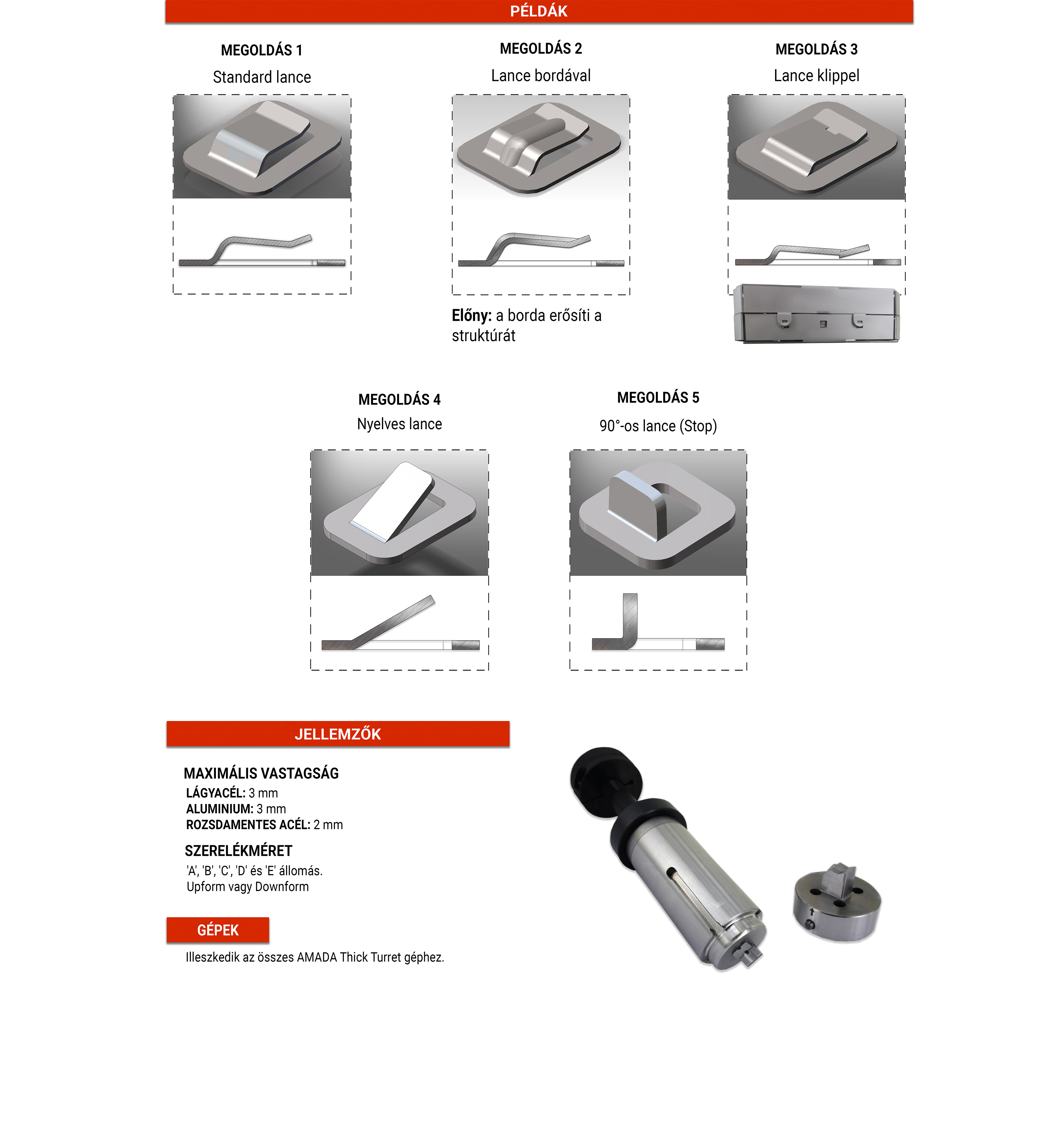 A megoldás különböző alkalmazásokhoz teszi lehetővé az egyidejű vágást és formázást a "lance" forma kialakításához . Általában összepattintandó alkatrészekhez vagy végállásokhoz használják. A "lance" formák különböző alakúak, profilúak vagy szögűek lehetnek.