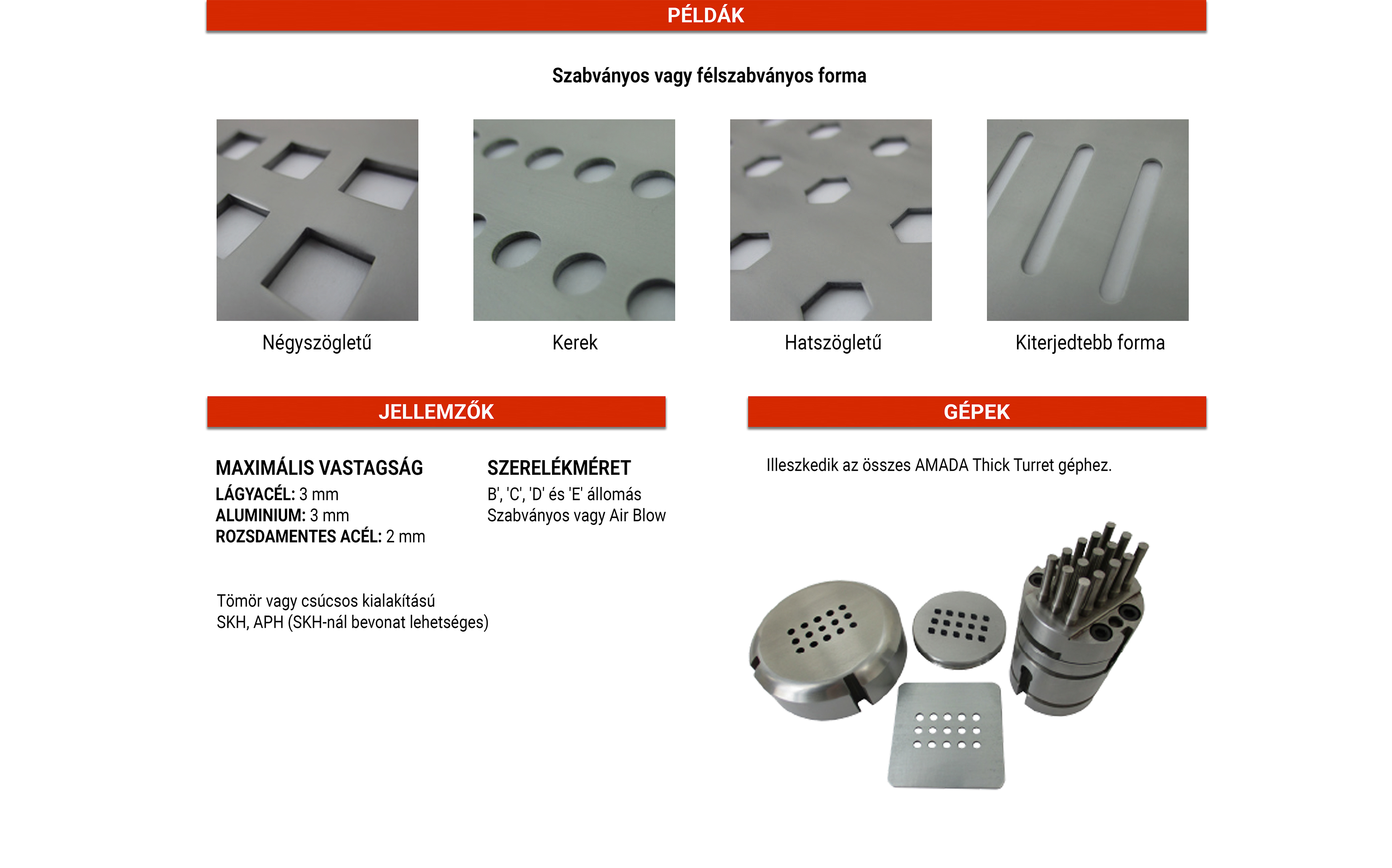 Gazdaságos megoldás a munkadarabokon nagy perforált területek egy ütéssel történő előállítására. Ez jelentősen csökkenti lyukak létrehozásához szükséges időt és a szerszámok karbantartási idejét. Sokoldalúan, többféle piacon is használható szerszám, mint ppédául az ipari és az építészeti alkalmazások.