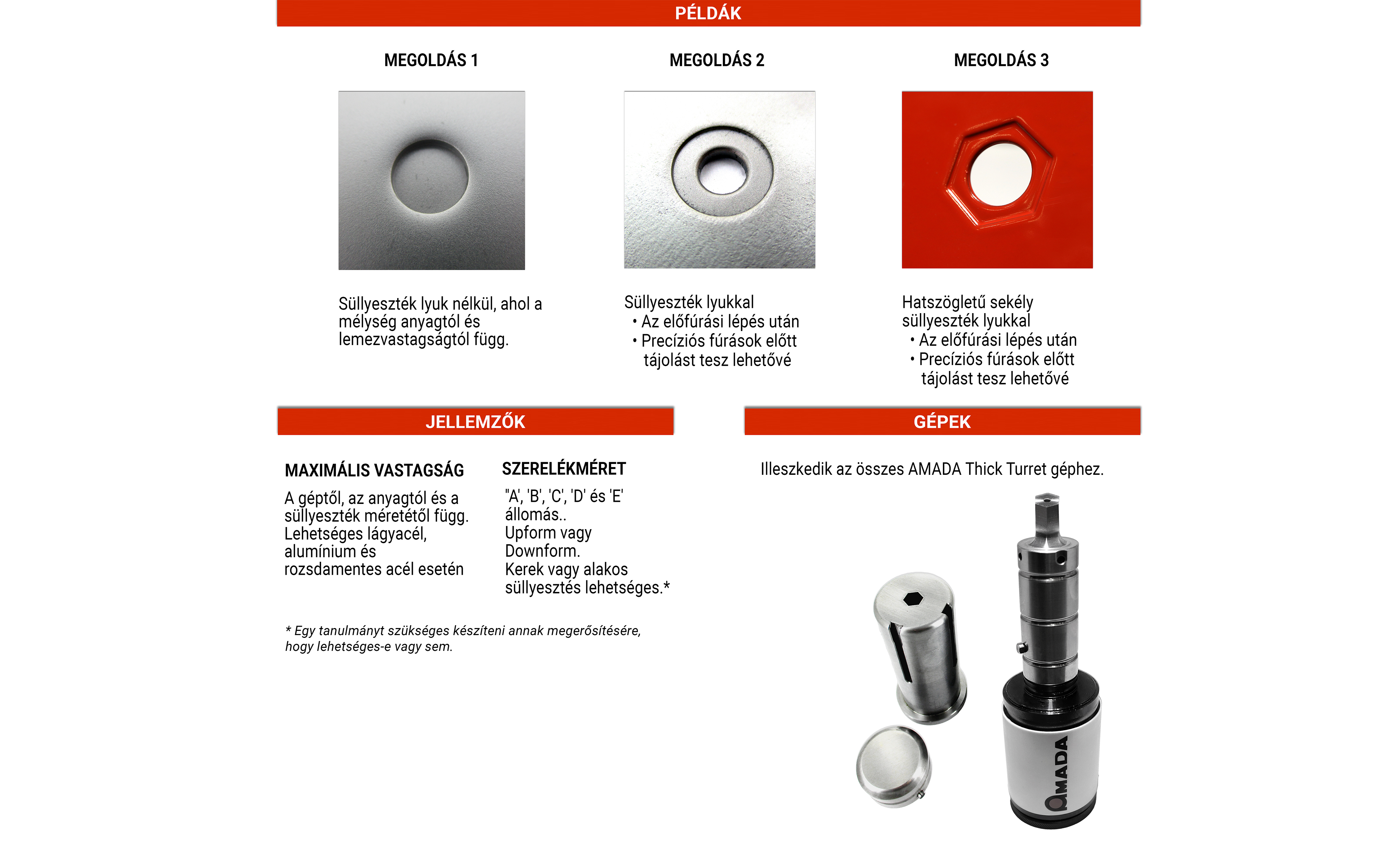 Egyszerű folyamattal megoldható a kis mélységű, lapos aljú süllyesztékek készítése. A lyukkal ellátott, vagy lyuk nélküli kerek süllyesztékektől kezdve a négyzet vagy hatszögletű süllyesztékekig olyan megoldásokat kínálunk, amelyek lehetővé teszik, hogy sík felületet kapjon, amelyre csavarfejet, alátétet, betétet vagy hasonló alkalmazást helyezhet el.